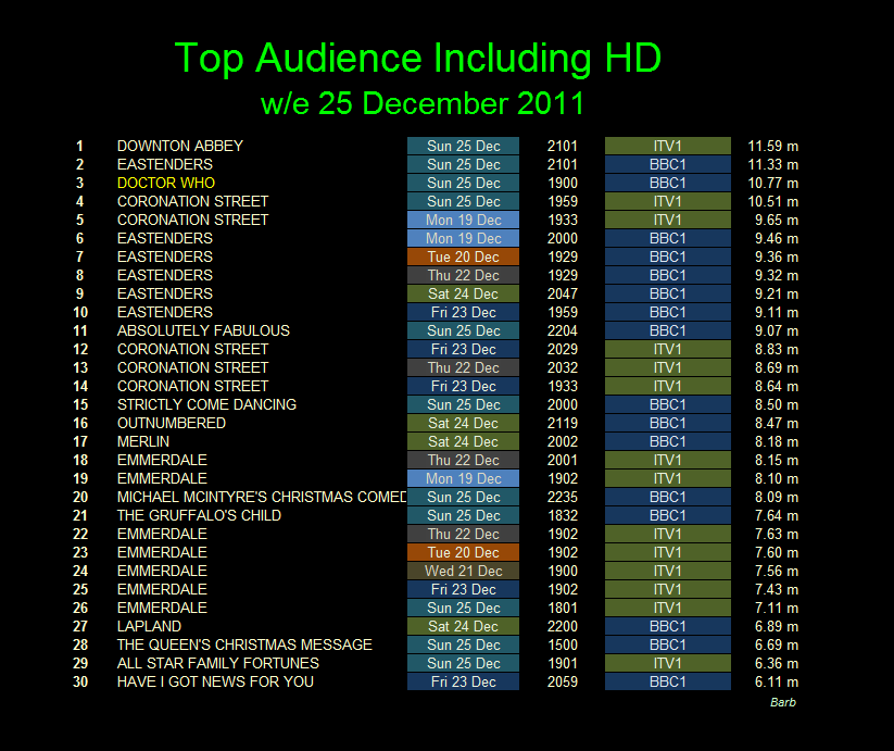 Finals: ITV1's Downton Abbey became the most watched programme of Christmas Day with 11.60m watching. EastEnders was second with 11.33m and Doctor Who came in third. Coronation Street was the 4th most watched programme of the day. Christmas Day dominated the ratings for the week, making Doctor Who the 3rd most watched programme for the week (second highest on BBC1)