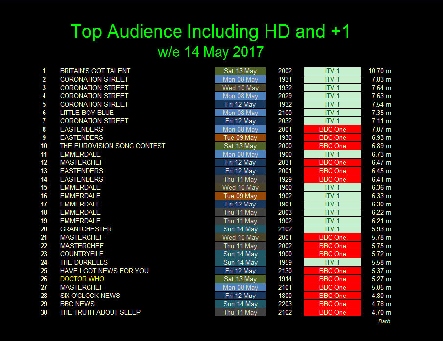 Overnight Viewing Figures: Live 2.62m, VOSDAL 3.57m (+0.95m): BBC One occupied three of the top four spots for the day, with Oxygen achieving fourth place; third place went to the preceeding Pointless Celebrities (which itself contained a Doctor Who related round) with just 100,000 additional viewers (3.58m/23.1%). The annual Eurovision Song Contest took second place with 6.73m viewers (35.2%). However, top spot once again went to ITV's Britain's Got Talent with 7.96m viewers (36.8% share). These are average figures across the whole of the programme, with the Eurovision Song Contest's audience reaching 8.37m (58.7% share) as the final results of the contest were being announced.