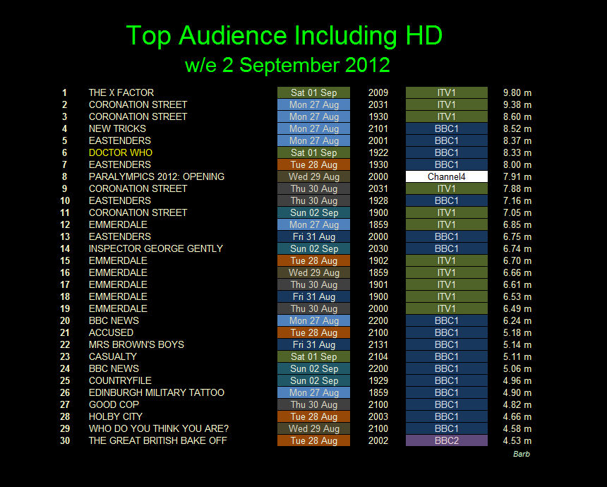 Finals: the episode was the third most-watched programme on BBC television for the week, with the crime series New Tricks taking top place followed by EastEnders. ITV had two episodes of Coronation Street and one of The X Factor in the list above the Doctor. While BBC One BARB listings include those watching on BBC One HD, ITV listings do not include ITV HD or ITV+1 which need to be added to the main channel statistics in order to compare like for like.