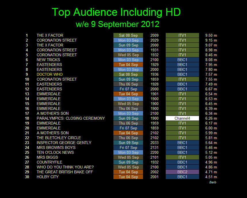Finals: the episode was the fourth for the week on BBC One with the crime series New Tricks taking top place followed by two episodes of EastEnders. ITV had three episodes of Coronation Street and two of The X Factor in the list above the Doctor. While BBC One BARB listings include those watching on BBC One HD, ITV listings do not include ITV HD or ITV+1 which need to be added to the main channel statistics in order to compare like for like.