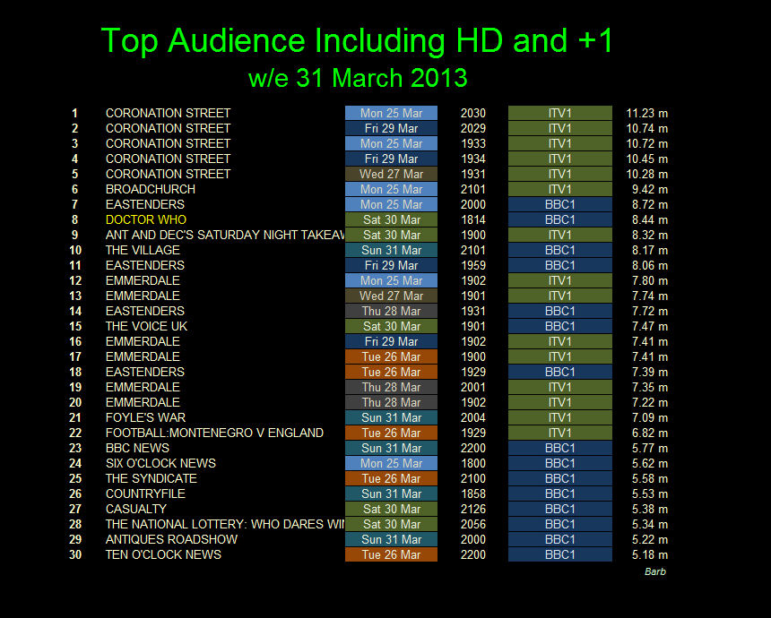 Finals: Doctor Who was the second highest rated show on BBC One for the week, only being beaten by one episode of EastEnders. It out-rated The Voice by nearly 1 million viewers, even though the two shows were level on overnight estimates. The only show to get a higher rating on ITV was Coronation Street where five episodes scored above Doctor Who.