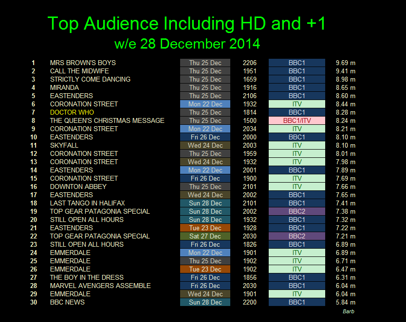 9.689 Mrs Browns Boys BBC1 25th 10:06pm (10:05pm) 9.407 Call The Midwife BBC1 25th 7:51pm ( 7:50pm) 8.979 Strictly Come Dancing BBC1 25th 4:59pm ( 5:00pm) 8.655 Miranda BBC1 25th 7:16pm ( 7:15pm) 8.604 Eastenders BBC1 25th 9:06pm ( 9:05pm) 8.291 Coronation Street ITV 22nd 7:32pm ( 7:30pm) 8.284 Doctor Who BBC1 25th 6:14pm ( 6:15pm) 8.21 The Queen's Christmas Message multi 25th 3:00pm 8.105 Eastenders BBC1 26th 8:00pm 8.080 Coronation Steeet ITV 22nd 8:34pm ( 8:30pm) 7.893 Eastenders BBC1 22nd 8:01pm ( 8:00pm) 7.772 Coronation Street ITV 25th 7:59pm ( 8:00pm) 7.691 Coronation Street ITV 24th 7:32pm ( 7:30pm) 7.654 Eastenders BBC1 24th 8:02pm ( 8:00pm) 7.406 Last Tango in Halifax BBC1 28th 9:01pm ( 9:00pm) 7.379 Top Gear Patagonia Special BBC2 28th 8:02pm ( 8:00pm) 7.361 Coronation Street ITV 26th 7:00pm 7.241 Downton Abbey ITV 25th 9:01pm ( 9:00pm) 7.214 Top Gear Patagonia Special BBC2 27th 8:30pm 6.739 Emmerdale ITV 22nd 7:01pm ( 7:00pm) 7.148 Skyfall ITV 24th 8:12pm ( 8:10pm) 6.518 Emmerdale ITV 25th 7:02pm ( 7:00pm) 6.239 Emmerdale ITV 23rd 7:02pm ( 7:00pm)