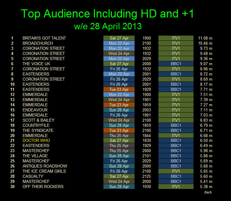 Finals: the consolidated figures after eight days indicated the Doctor Who had reached 6.52m (30.2% share); for BBC1 it was the seventh most watched programme of the week. Overall, once ITV HD and +1 figures are factored in, Doctor Who just slipped out of the top twenty as the 21st most watched programme on British Television for the week; Britain's Got Talent was top at 10.48m (44.05%), Broadchurch second with 10.46m, whilst BBC1's top show The Voice was sixth at 9.07m (36.8%).