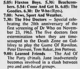 News clipping from p10 of the Sydney Morning Herald (Australia) showing the broadcast of The Five Doctors on 13 Dec 1983 | |||||