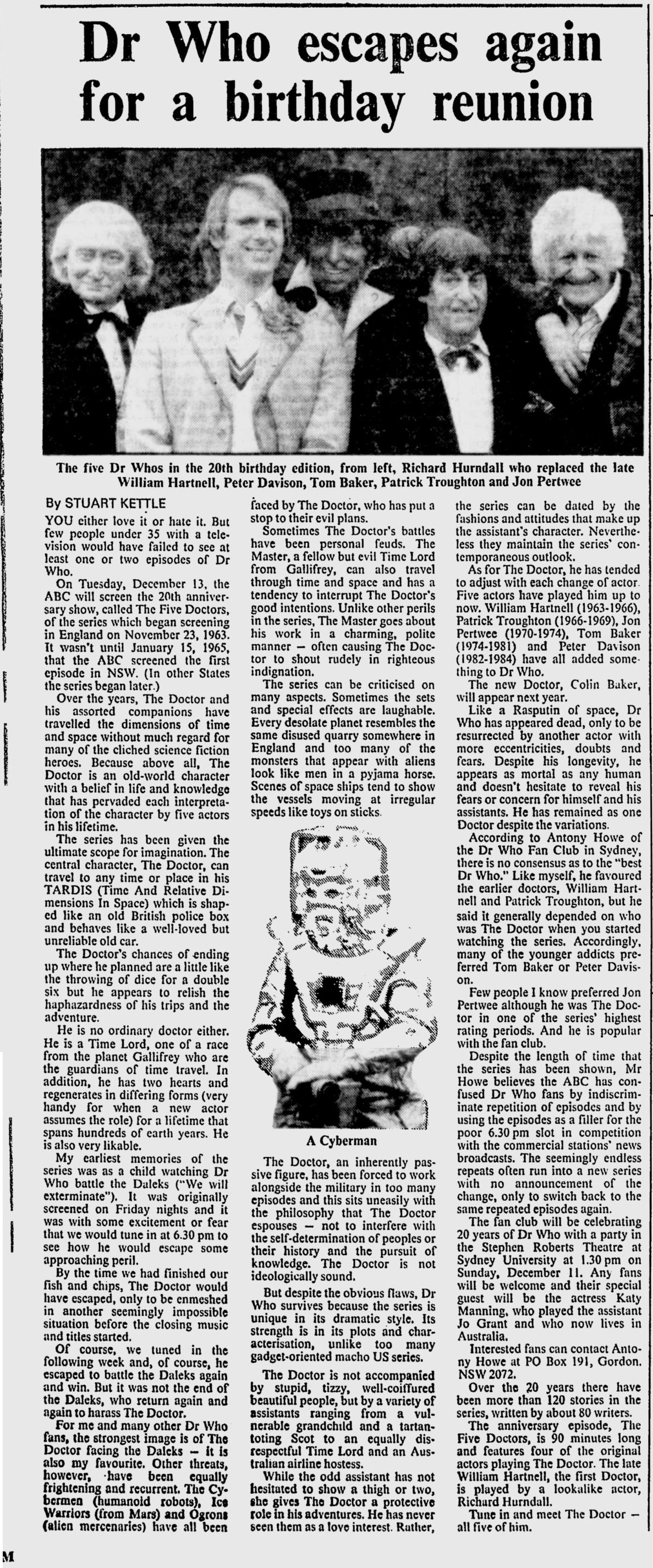News clipping from p3 of The Guide, a section from the Sydney Morning Herald (Australia) promoting the broadcast of The Five Doctors on 13 Dec 1983 | |||||