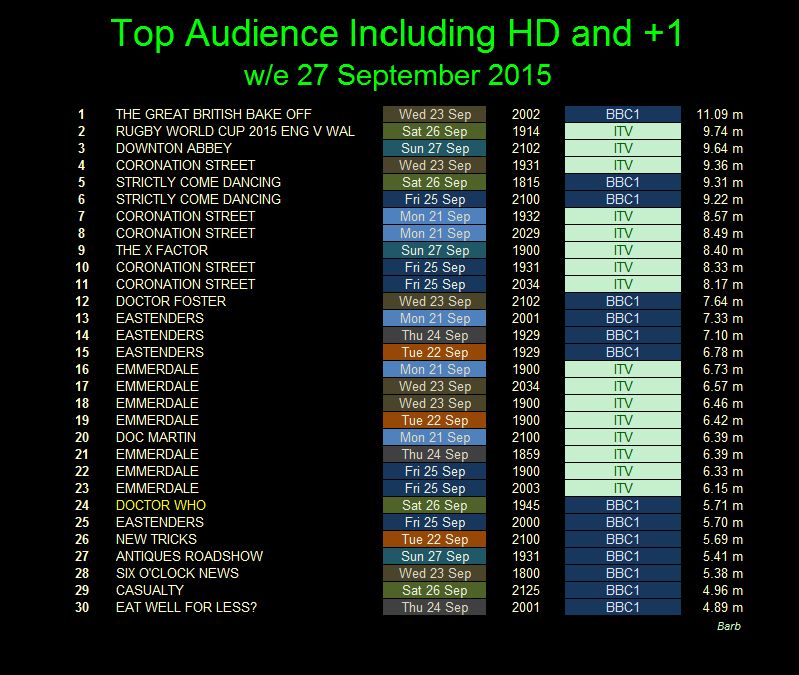 Finals (+7 days): The rating makes Doctor Who the 24th most watched programme on British Television for the week and the 8th most watched BBC programme for the week.The live Rugby where England played Wales, which took a sizable proportion of Doctor Who's audience, finished with a consolidated rating of 8.96 million. Top of the list was The Great British Bake Off which had a final audience of 11.09 million viewers.The final rating of 5.71 million is the lowest since the series returned in 2005 to date, although Silence in the Library in 2008, had a lower chart position with 27th.